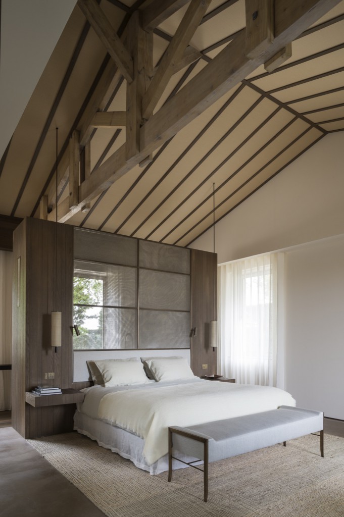 The bedside tables had to be quite small so the designer could base these new versions on spindly antique French Empire nightstands. In here, we can see beautiful olive green walls, pale pink woodwork, and a toffee-colored ceiling. David Hicks was the big inspiration behind this successfully achieved bedroom suite.