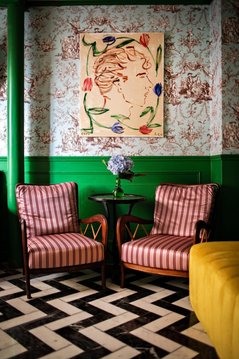 One of the best displays is in the lobby, which is so outrageous and authentic. The electric pea-green lobby is full of life and saturated colors, that combine perfectly. The result, as you can see, is breathtaking and the designer hand-decorated the William Kent–inspired mirror.