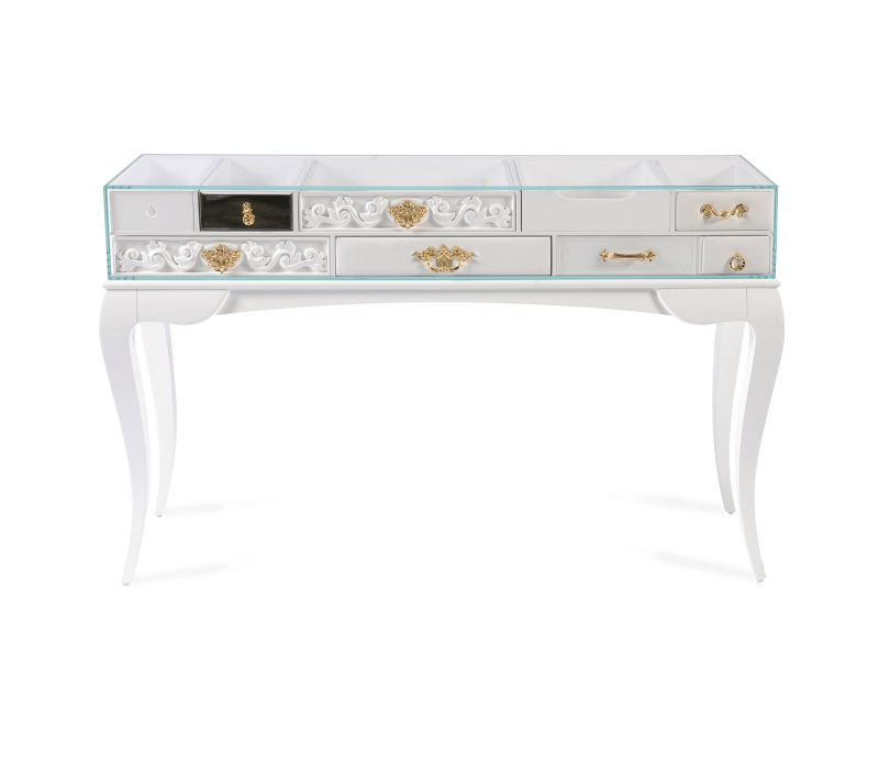 York is a tribute to two of our most popular designs, Trinity and Mondrian. It excels by being one of the most classic additions to the Soho Collection, and fits perfectly a modern entrance hall, bringing an elegant touch to any decor. Created within the Boca do Lobo’s style, with a blend of classic and contemporary elements, its sinuous wood legs support a glass box that encases a collection of leather, hand-carved mahogany, mirror, and lacquered drawers with distinct handcrafted brass pulls in a chrome finish.