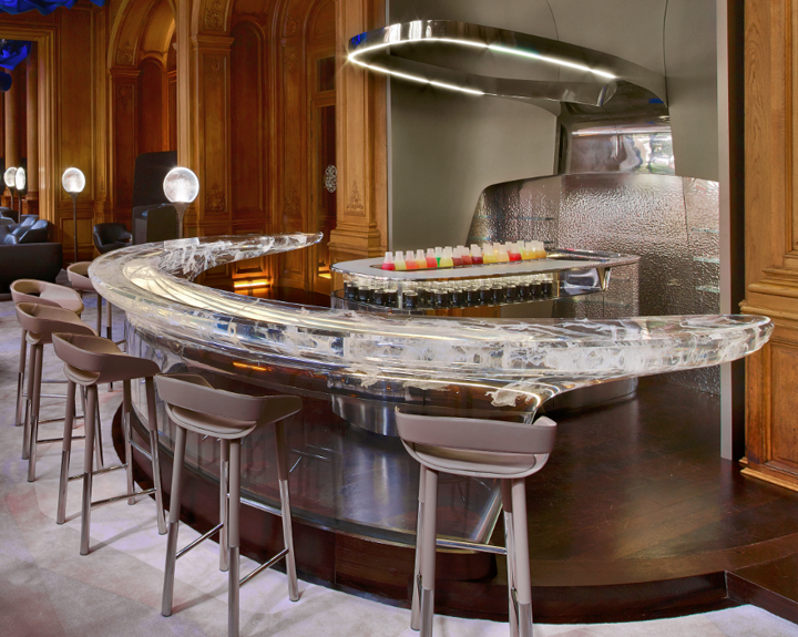 The result of a collaboration between paris based jouin manku studio and patrick jouin ID, the ‘mandarin oriental hotel‘ located in paris, france has recently opened to the public. Sited within the heart of the city, this venue provides two restaurants, a bar, cake shop, and gardens of diverse atmospheres. Vegetated spaces lead guests into a light filled dining space scented with camellias to blend the interior and exterior boundary. The deliberate surfacing of columns and circulation areas with wood veneer evokes imagery of garden trees and pathways. A distinctive fabrication for this project, the table and chairs’ legs mimic wooded plantings growing from the earth.
