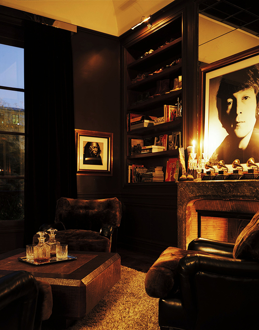 In the small library lounge, the many awards of the singer-musician-producer are arranged under a portrait of John Lennon. The mottled armchairs have been dressed in fur, around a coffee table by Karl Springer.