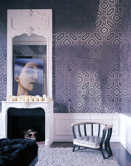 In a guest room, covered with silver and chocolate wallpaper from Flavor Paper, there’s a painting by Ara Starck is placed on the fireplace. Next to it, there’s an exquisite armchair covered with snakeskin.