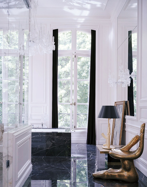In the star’s bathroom, marble, woodwork, and Baccarat crystal. On the left, you can see the huge hammam. In the foreground, a sculpted chair by Pedro Friedeberg and a Gun lamp by Philippe Starck for Flos. As you can see, Lenny Kravitz‘s palace is an absolute dream!