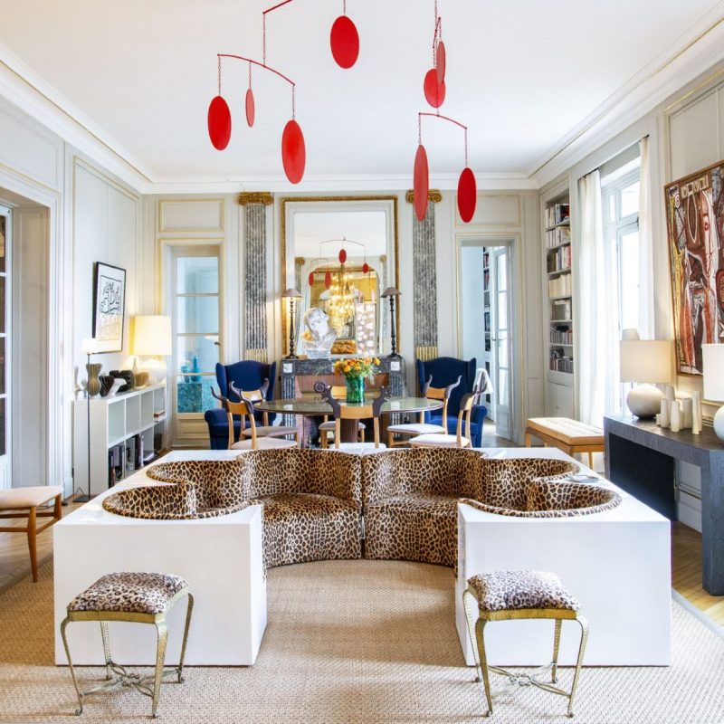 The main salon was decorated in the 1950s by the decorating firm Maison Jansen. The large white and animal print safari sofa is by the Italian design studio Archizoom from 1968. The iron stools are by Italian designer Pier Luigi Colli circa 1950. The ceiling mobile is by British artist Marc Cavell. In the background is a dining room table by Italian architect Carlo di Carli, and the armchairs are by Christian Lacroix.