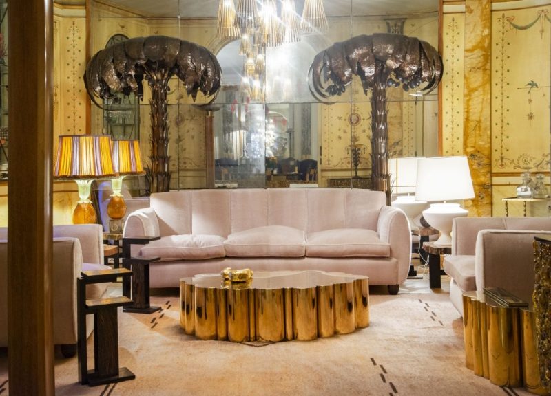 In the living room, there’s a Cloud Table by Kam Tin and the sofa and armchairs are from 1930 by an Italian architect and designer of Danish origin, Guglielmo Ulrich. The palm trees are in bronze patinated brass and the little side tables are by French designer André Sornay from the 1940s. The Murano glass lamp is also from the 1940s, while the plaster light is from the 1960s.