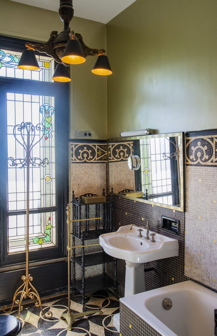 All of the decoration is original to the apartment. On the walls of a bathroom are marble mosaics, and the stained-glass window is early 20th-century. The walls are lacquered paint and the chandelier is 19th-century, found at the flea market in the South of France, L’ Isle Sur la Sorgue. The coatrack is in gilded iron, circa 1950, by Italian designer Pier Luigi Colli.