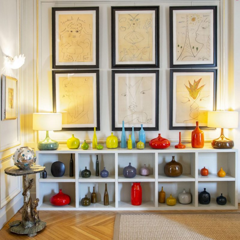 First off on this amazing tour, we present you with Rapin’s collection of Ruelland French ceramics from the 1960s. On the wall hang six drawings by Jean Cocteau, also from the 1960s. The little tables in silvered wood are Austrian from the end of the 19th century and the vases are silver and hardstones by Kam Tin.
