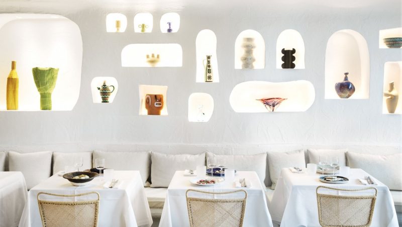 Born and raised in Provence in the south of France, the Mediterranean countryside is a constant source of inspiration for Jacquemus, as attested by Café Citron, the designer’s first restaurant for Galeries Lafayette Champs-Elysées located on the first floor. But whereas the latter has the outdoorsy feel of a Provençal village, Oursin has a more intimate vibe. Featuring undulating whitewashed walls playfully punctured by sculpted alcoves adorned with an eclectic collection of colourful Picasso-esque vases, bowls and other decorative objects that Jacquemus handpicked in flea markets or pried from his own personal collection, space transports guests into a rural courtyard in the South of France, to the property of some artist and gourmand perhaps, where art meets gastronomy.