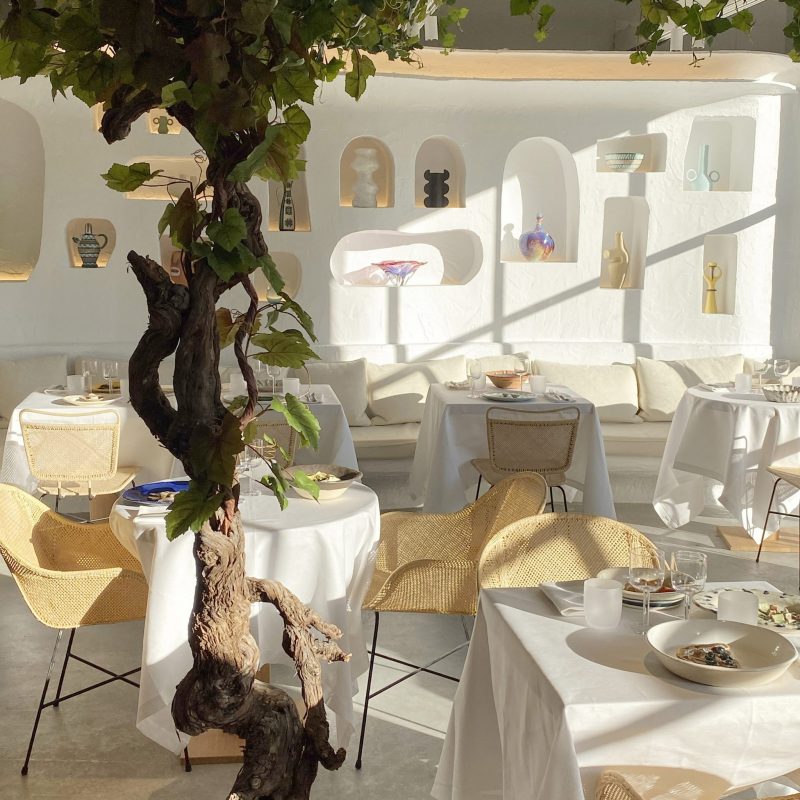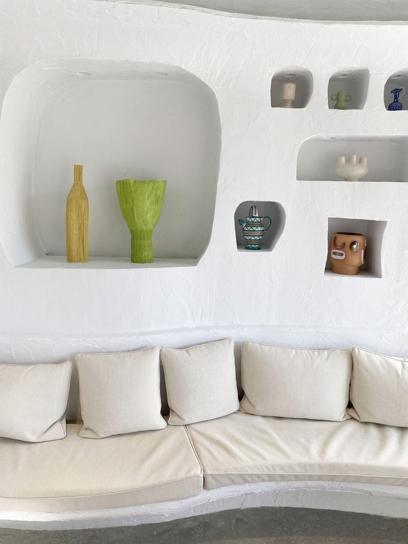 Oursin’s sculpted, whitewashed interior undoubtedly evokes the vernacular architecture of Southern Europe. It also, however, draws inspiration from French architect Jacques Couelle whose sculptural, a grotto-like house in Provence Jacquemus has vacationed in, and multidisciplinary artist and South of France native Valentine Schlegel whose work combines organic abstraction with modernist simplicity. A vine tree climbing all the way to the ceiling at the centre of the room and the abundance of sunlight flooding through large windows reminiscent of Cezanne’s Aix-en-Provence studio, further imprint the sense of the Mediterranean summer as do the handmade wooden rattan chairs and the sand-coloured serpentine banquette seating.