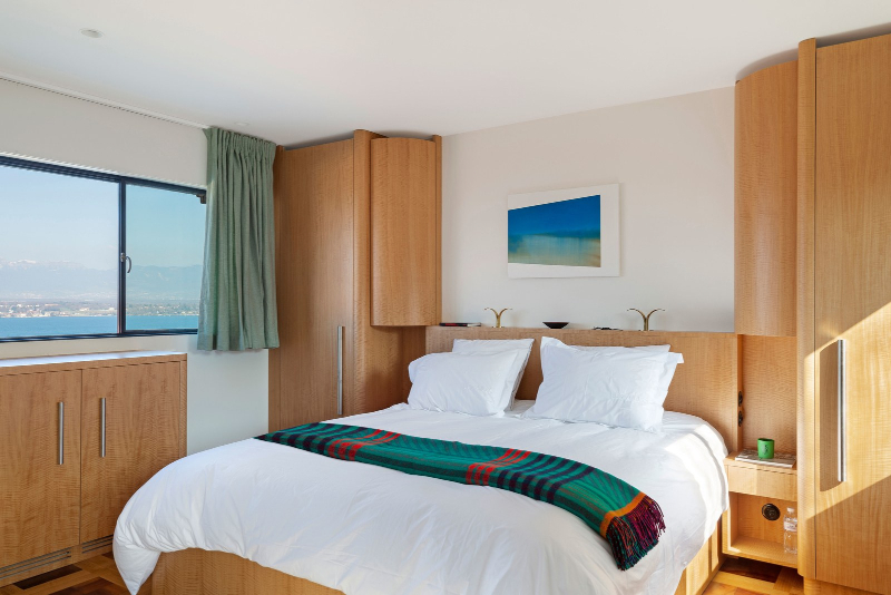 master bedroom has a beautiful view of the lake and a large private terrace, which proves the power of an incredible villa over Geneva. Hanging above the bed is a 2018 oil painting by Koka Ramishvili titled Nightfly. None of this project could have been done if it wasn’t for the discovery of potential by Hubert Bonnet, the architect