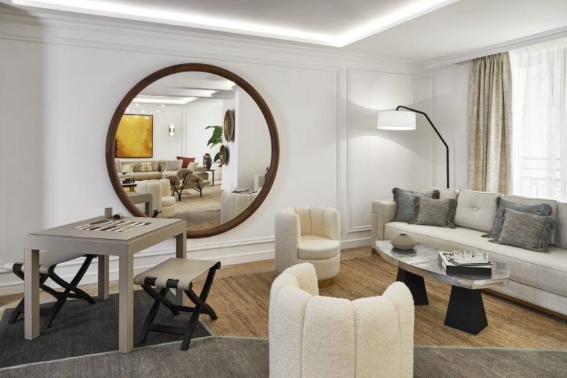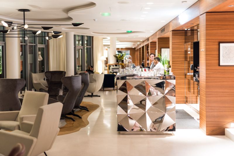 All the 121 modern bedrooms are inspired by local artist workshops and feature natural wood and earth tones, which complement Tom Dixon’s “Art et Floritude” modern lighting, while vintage furniture with a unique design by Jean Prouvet and Charlotte Perriand reflect the luxury hotel’s uncommon and imposing heritage.