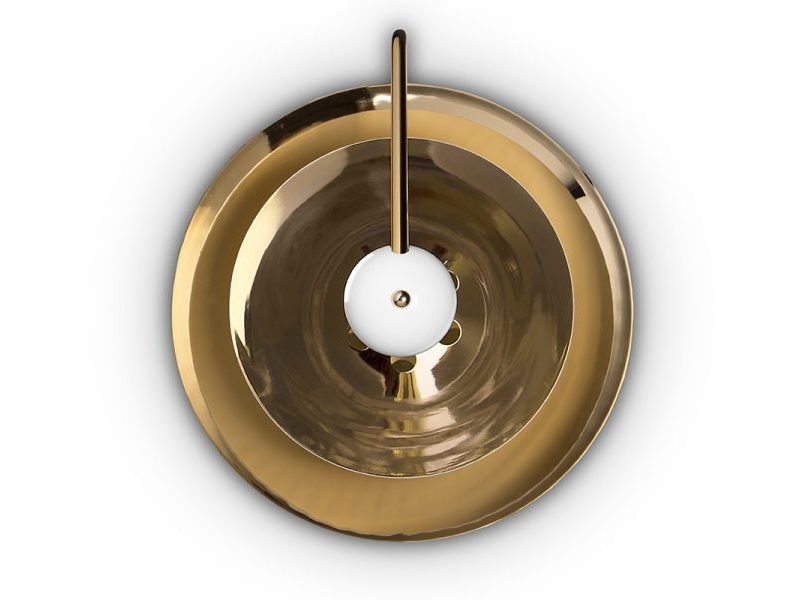 Basie wall light fixture is a modern representation of the sci-fi aesthetics of the 1960s. The vintage mid-century lamp has a set of distinctive features which make it a stunning statement piece. It is an indoor wall light handmade in brass, with a centre shade made in aluminium and a mesmerizing gold-plated standard finish.