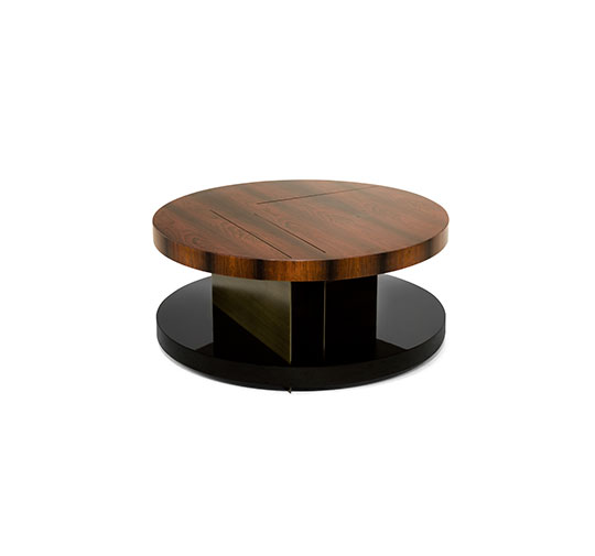 The Lowlands of Scotland are called Lallans, which also refers to a combination of some Scottish dialects. Just like LALLAN Round centre Table combines four different materials and finishes, such as palisander wood veneer, black lacquer, polished brass and antique brass. Despite their asymmetry, these blend perfectly into an elegant round coffee table.