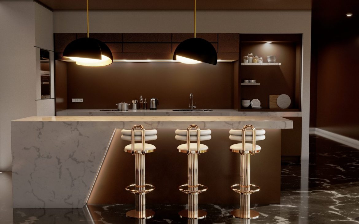 Get to know this timeless living room design with luxury furnishings of the new Happy Few collections designed by Essential Home in partnership with Studiopepe. A seating area with the strong presence of the Zelda family with both Zelda small armchairs and the Zelda sofa upholstered in the finest textile with a brass body. To support the seating space, there’s the Philip long center table and the Philip side table, both made of wood and beautiful travertine stone. Both brass Brubeck XL wall lamps, as well as the white-shaded Laine suspension lamp from DelightFULL give the whole ambiance that extra glow.