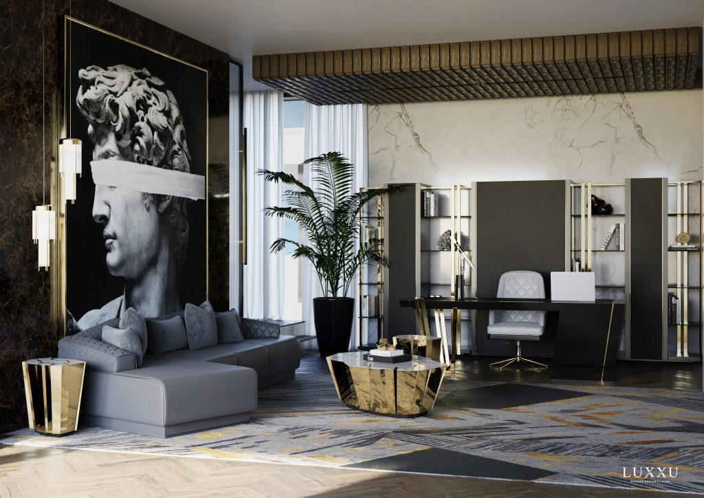A wonderful black and white living room with golden and platinum touches that make all the difference.