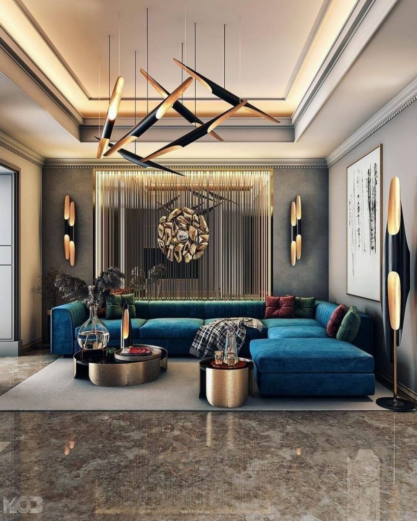 A modern blue sofa with sleek and modern lighting ideas that make a statement.