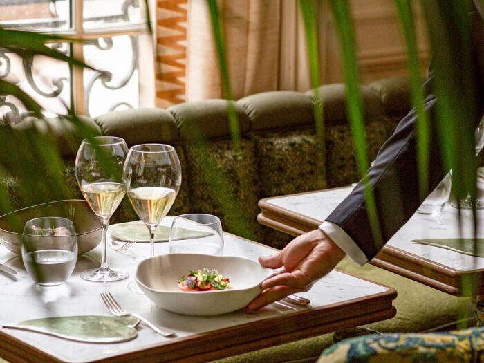 In summertime, the Chef Julien Dumas offers an alternative summer menu, realized in front of the guests on the brasero. The Terrace is set under the majestic, Versailles-green gazebo, designed like the extension of a French garden.