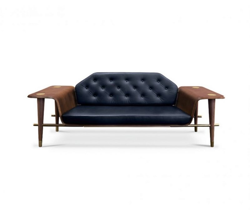 Perfect for a private lounge, the Curtis sofa with a long wooden bench is produced in dark walnut. It has a single back cushion, upholstered with tufted leather, as well as two arms that can be used as side tables. It also features a round tapered leg with polished brass feet that create a contrast with its dark tones.
