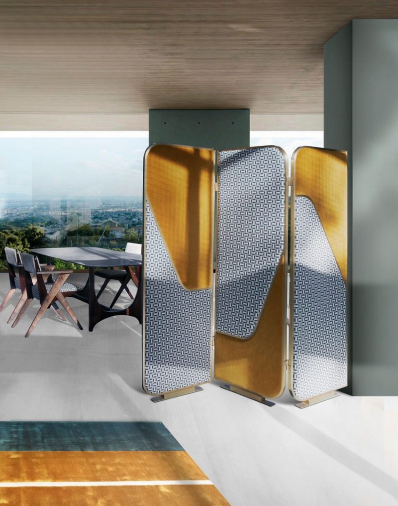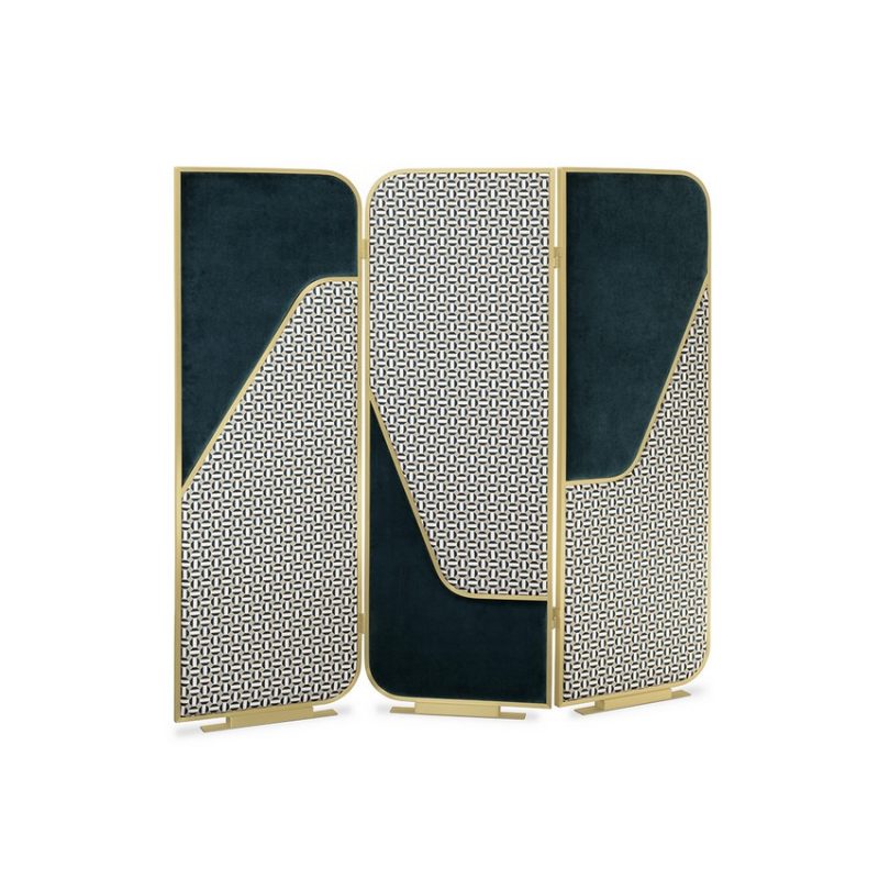 Giulietta screen has a precious crossing curved brass frame. Named after Giulietta Masina, it creates an elegant dialogue with the upholstery-deep yellow or peacock velvet combined with a fifties’ taste fabric.