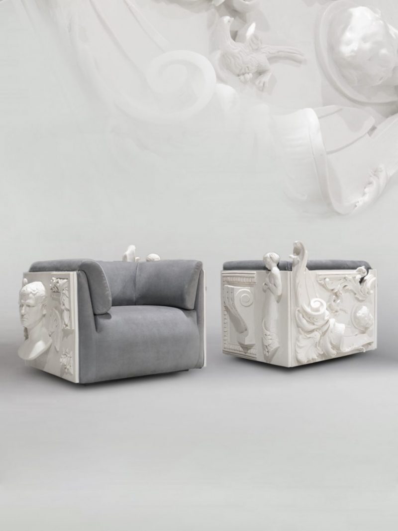 The creativity and rich decoration of the Versailles Palace contributed to the inspiration for the creation of this exuberant furniture design. Boca do Lobo opens the way to freedom and the need for bringing extravagant creations to life. Both the sofa and the armchair are made in a wood structure and feature panels in a manual sculpture, produced in resin and finished with restoration techniques similar to stone.