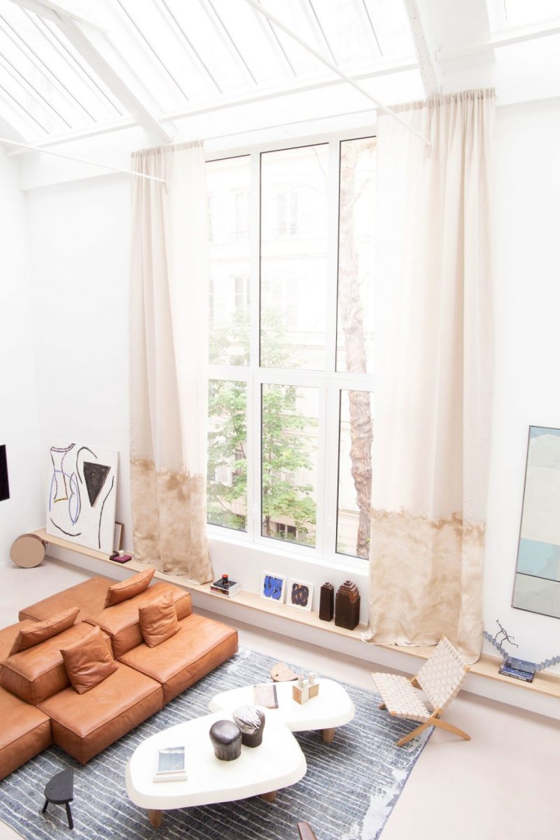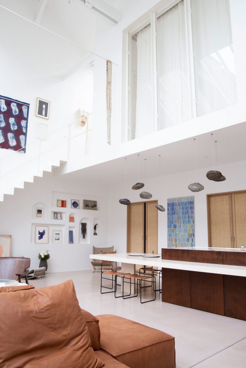 Amélie decided to furnish the apartment with a perfect combination of vintage and contemporary pieces, due to the specifics of this apartment. Through its high ceiling, floor-to-ceiling windows and glass roof, the main living room is surrounded by sunlight and exquisite pieces. All-white spaces were required for this apartment, due to Amélie’s needs to fill it with eccentric and incredible art pieces.