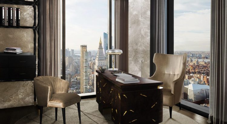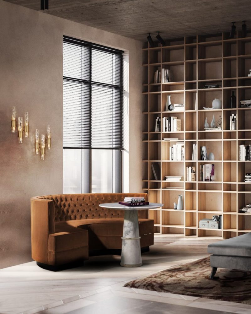 This splendid home library has the NAJ Bench, AGRA Coffee Table, BOURBON Round Sofa, OMBAK Wall Light and the rug MERFILUS by Rug’Society.