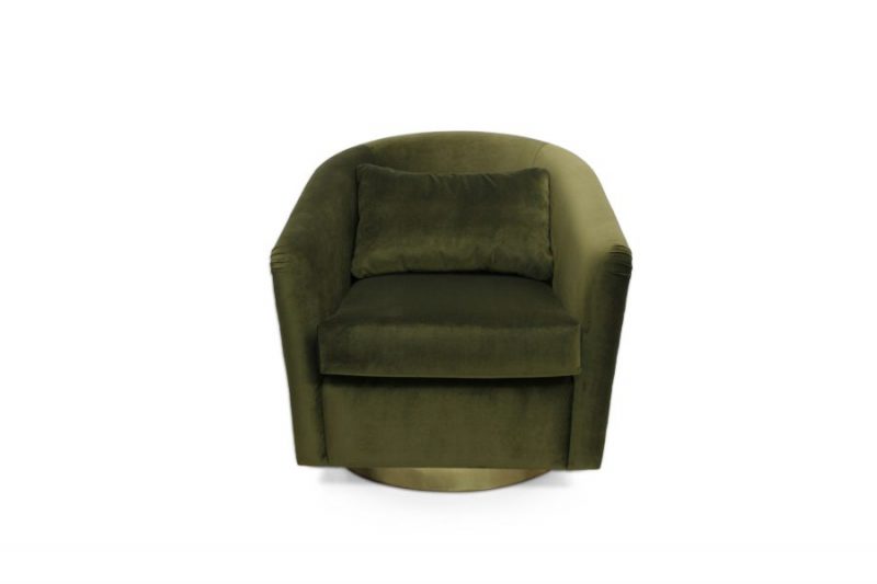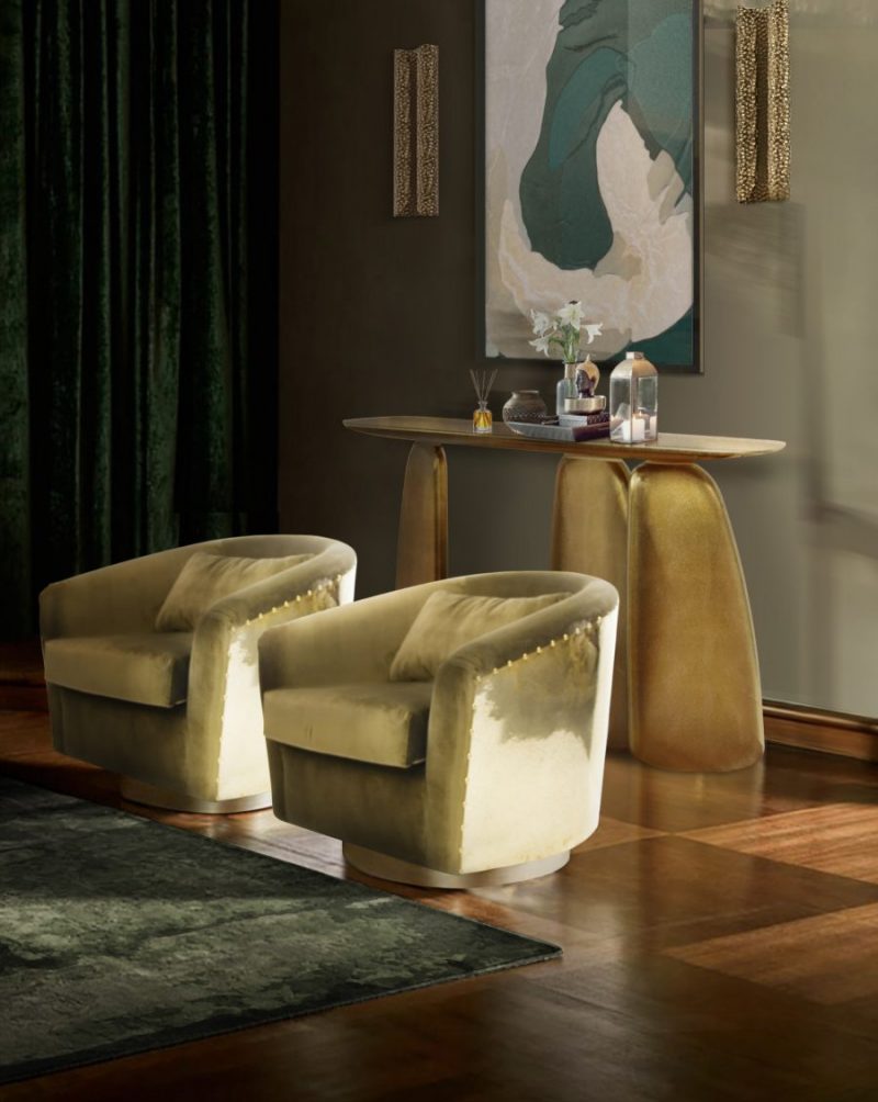 The compelling rotation of the Earth around its own axis inspired the creation of EARTH Armchair. Upholstered in cotton velvet, this armchair with shelter-style arms has a unique hammered brass back with golden polished nailhead trim. It is this barrel-shaped designed chair that will make a statement in modern interior design.