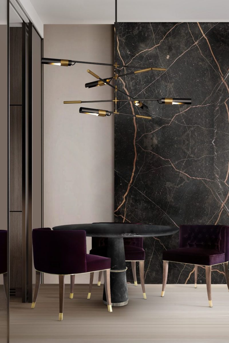 This elegant dining room has the AGRA Dining Table, BOURBON Dining Chair and KOBEN Suspension Light.
