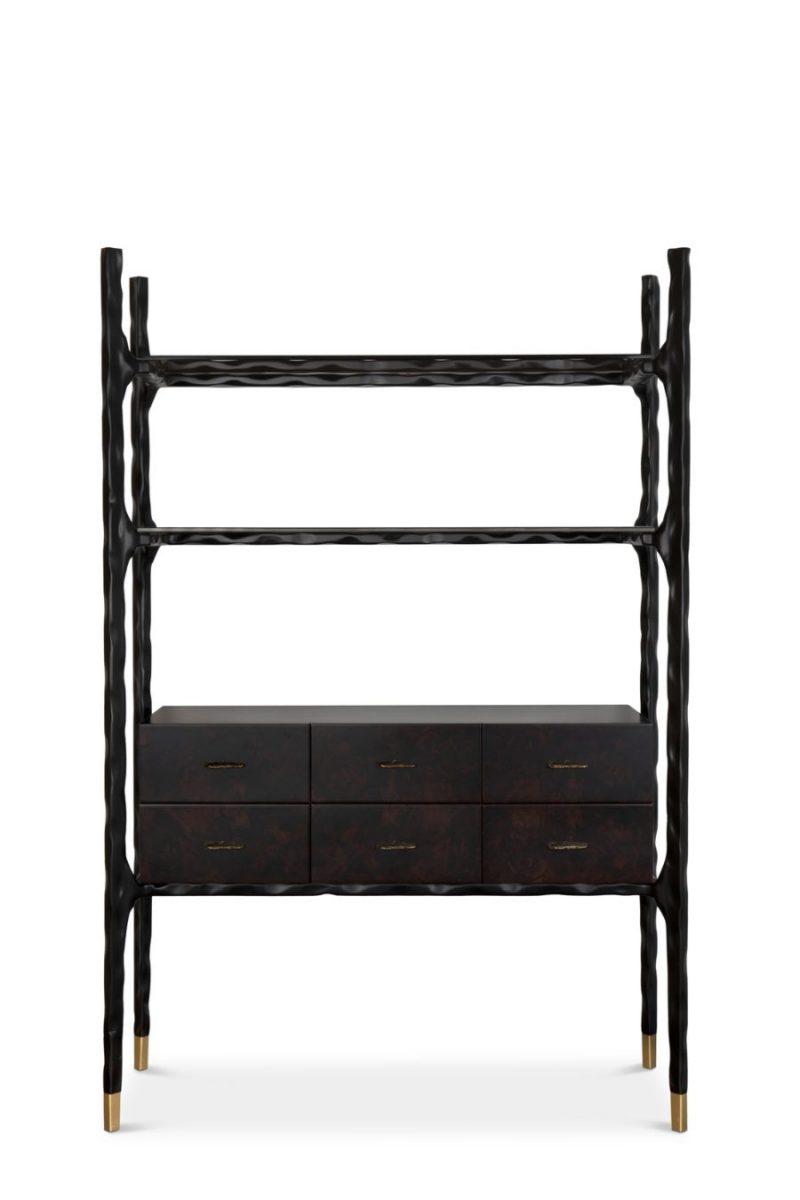 LANKA Bookcase is inspired in a traditional method practised in Sri Lanka, the stilt fishing, now disappearing. The vertical poles embedded into the seafloor are the main reference for the structure of LANKA: in matte black lacquer, it supports the main body covered in matte palisander wood veneer, and with matte brass details. This bookshelf is an elegant choice for any room in a residential or hotel project.