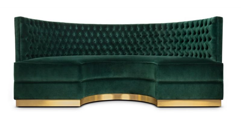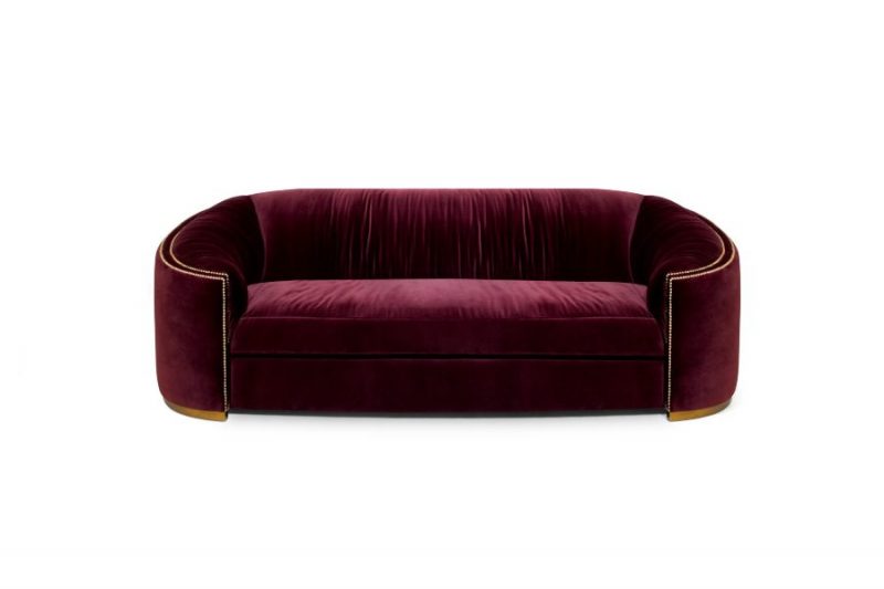 Often called the “Land of Castles”, Wales has some of the most impressive monuments of the Middle Ages. WALES Sofa pays tribute to the country’s history. Upholstered in cotton velvet and with a base in matte vintage brass, this curved sofa features a golden polished nailhead trim that makes it even more elegant.