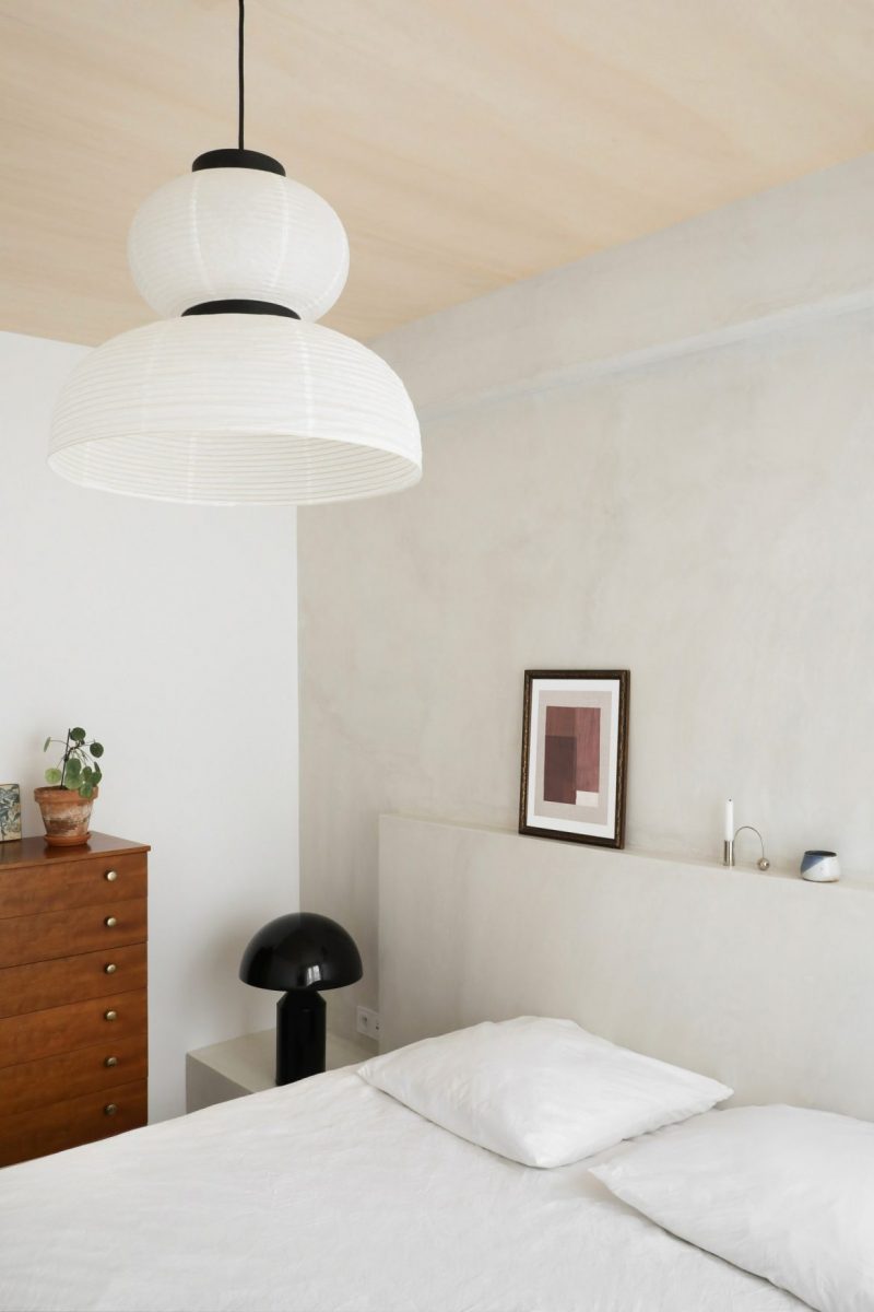 The serene primary bedroom features an Oluce lamp, a Ferm Living candleholder, and an &Tradition pendant lamp.
