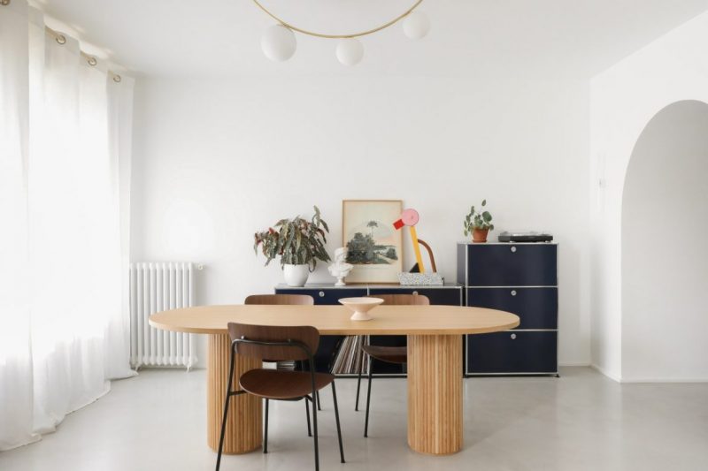 In the dining room, &Tradition chairs surround the made-to-measure table by Heju with an Atelier Areti ceiling light above this minimalism area. An Ettore Sottsass table lamp sits on the USM shelves.