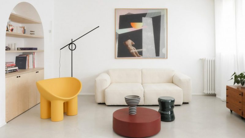 The simple Hay sofa with the Benjamin Rossignol artwork creates an atmosphere of lightness with the perfect pop of color. One of the biggest changes to the home was this arched “living wall” created by the architects. The yellow Roly Poly chair by Faye Toogood adds a pop of color to the living room furnished with a Serax coffee table and vases by AYTM and LRNCE.