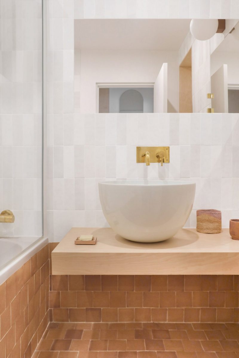 An &Tradition wall light was placed in the beautiful and relaxing bathroom, due to its natural materials, such as light wood, and marble.